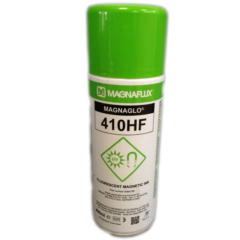 Использование при проведении магнитопорошкового контроля суспензия 410 HF Magnaflux позволяет гарантировано выявлять в ферромагнитных материалах наличие и местонахождение поверхностных и подповерхностных несплошностей: включений, разрывов, флокенов, раковин, сварочных дефектов, шлифовочных, закалочных и усталостных трещин и других дефектов. Суспензия Magnaglo 410 HF дает четкий зеленый индикаторный рисунок, видимый в ультрафиолетовом свете с длиной волны 365 нм. Размеры частиц суспензии 410HF больше, чем размер частиц суспензии Magnaglo 14 HF, что позволяет проводить люминесцентный магнитопорошковый контроль без обеспечения 100% затемнения зоны осмотра.Применение: